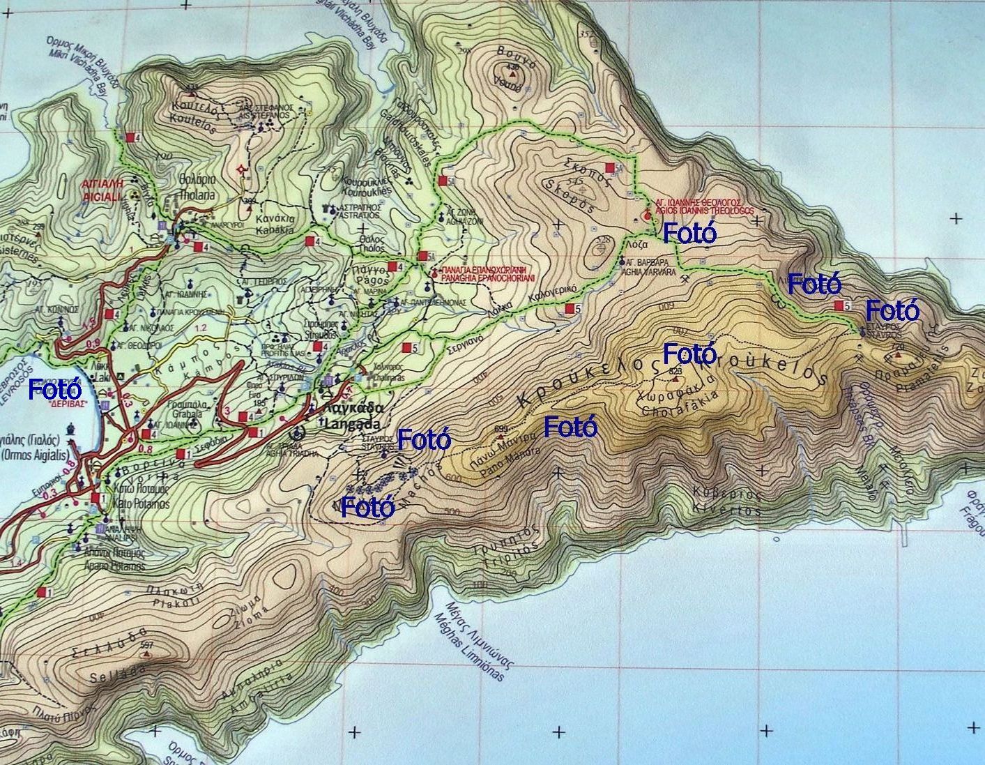 A térképen zölddel berajzolt turistautak közül a 4-es úton indulunk fel Langhada településhez, ott át az 5-ös útra. A Fotó feliratok mutatják nagyjából a fotók helyszínét.